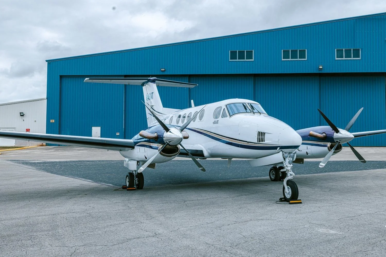 Beechcraft King Air 200 twin-turboprop aircraft parked on runway, ideal for regional private flights in Europe