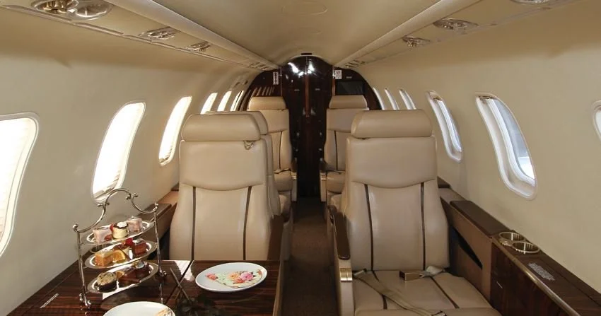 Learjet 45 XR cabin interior with double-club seating for 8 passengers and fully enclosed lavatory